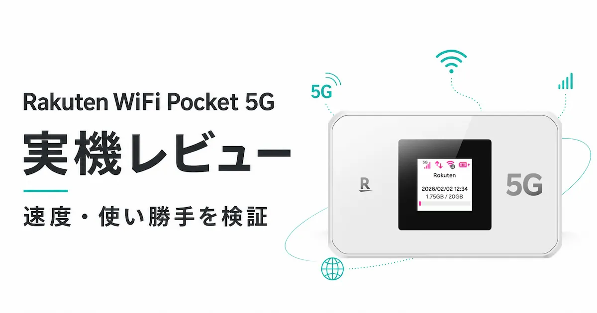 楽天モバイルから2026年3月3日に発売された5G対応モバイルWi-Fiルーター「Rakuten WiFi Pocket 5G」。最大2.14Gbpsの高速通信、4,000mAhの大容量バッテリー、最大24台同時接続といった特徴を備えた注目の端末ですが、2026年3月下旬以降、楽天モバイル公式サイト上では「販売を一時停止しております」と案内されている状況です。本記事では、SIMえらび編集部が発売直後に購入し、実際に外出先での作業用途で使い続けている実機レビューとして、スペック・料金・使い勝手を整理し、競合のホームルーター・ポケット型WiFiと中立的に比較します。